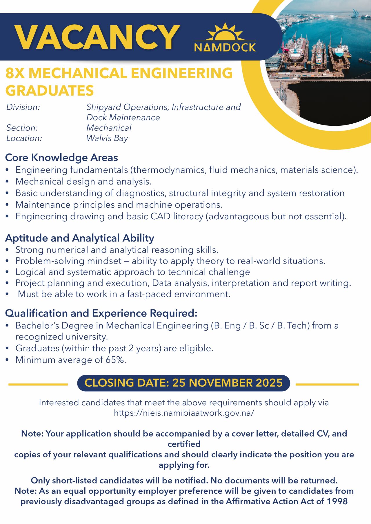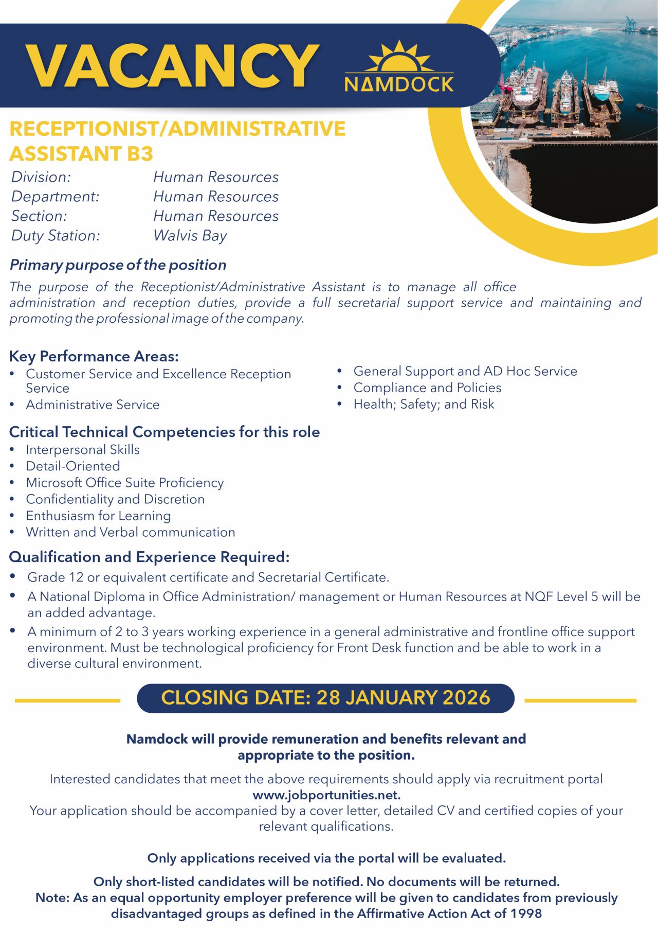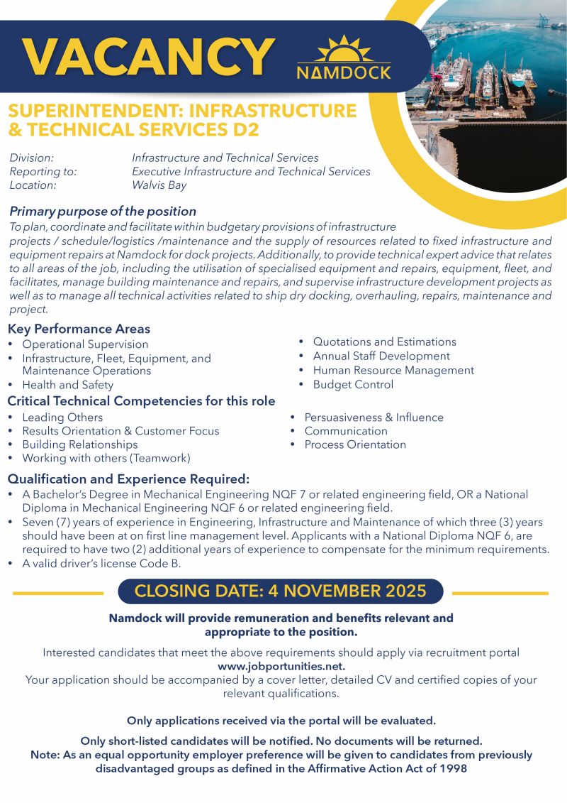 Namdock is committed to building transparent, efficient, and fair recruitment processes. As part of this commitment, we have launched our online Recruitment Portal, which provides a central platform for managing and publishing vacancies, creating a talent database and allowing for easier applications.